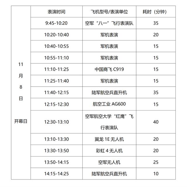 其中在11月8日开幕日,“八一”、“红鹰”、C919、AG600、翼龙1E无人机、彩虹4无人机等飞行表演队伍和明星机型将悉数登场。