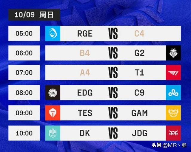 2. 2022.10.9/周日(小组赛第一轮)5:00 RGE VS C4(C组4号队伍,即入围赛突围的队伍且分在C组)6:00 B4 VS G2(B组4号队伍,即入围赛突围的队伍且分在B组)7:00 A4 VS T1(A组4号队伍,即入围赛突围的队伍且分在A组)8:00 EDG VS C99:00 TES VS GAM10:00 DK VS JDG