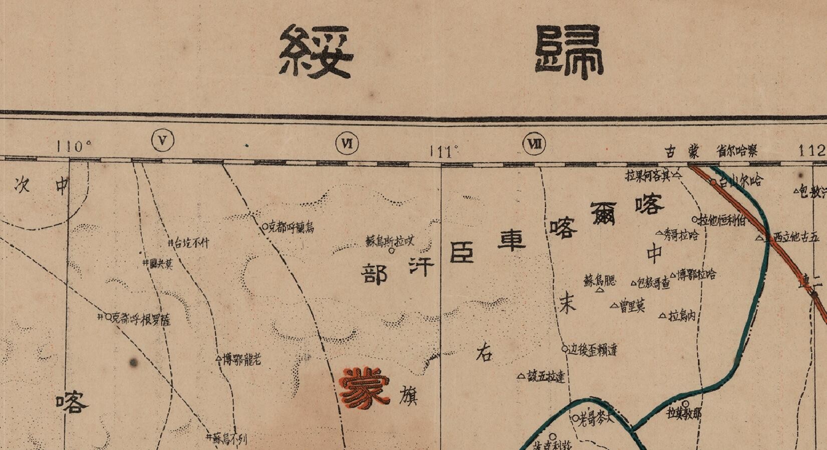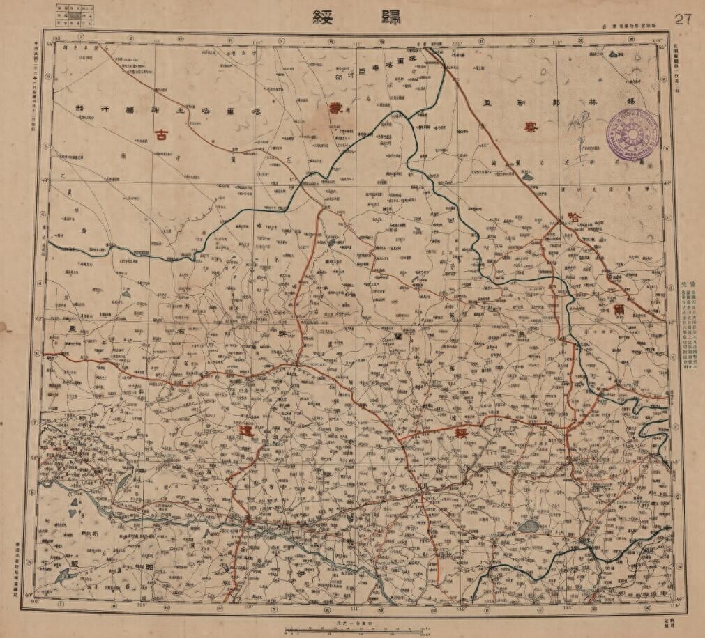 民国二十六年(1937年)内蒙古老地图,图名为归绥(归化绥远),图中包含内蒙古察哈尔省等区域,图中最北部为喀而喀车臣汗部、二连浩特等,左上为喀尔喀土谢图汗部,右上为锡林郭勒盟,中部为乌兰察布盟,左下为伊克昭盟,全图范围四至,请看图片。