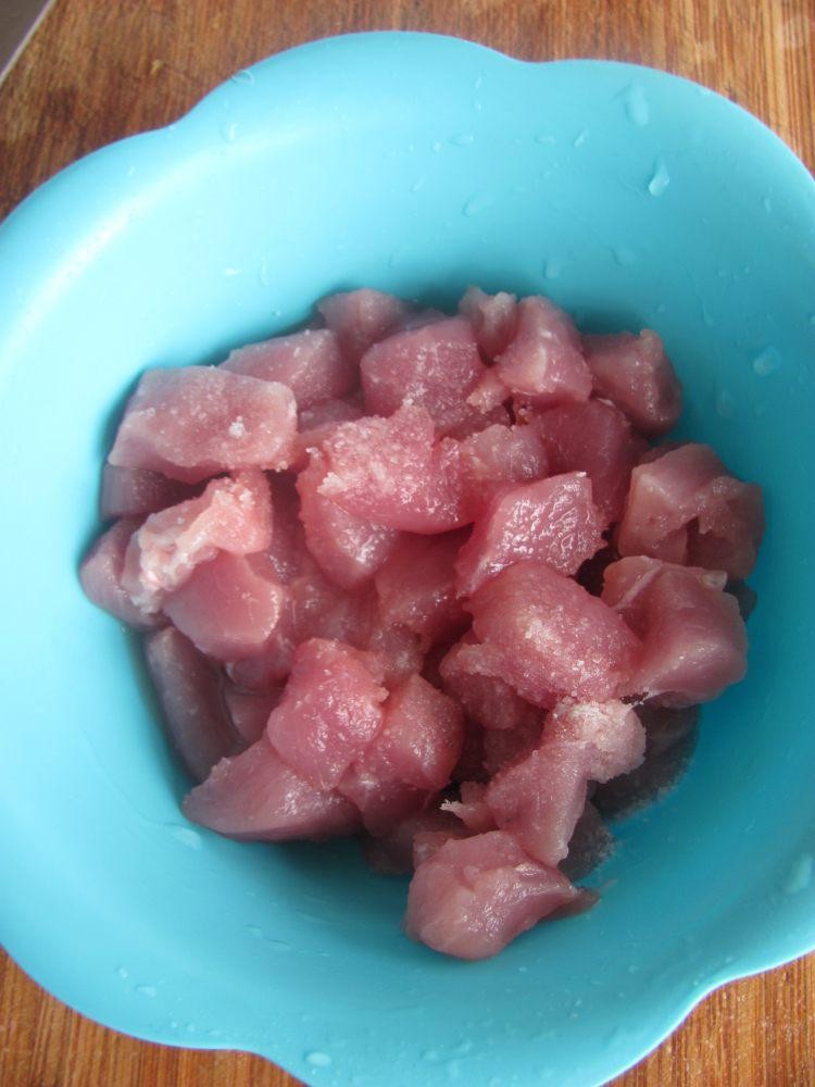 2、猪肉洗净切寸块,加少许盐和料酒腌拌10分钟。