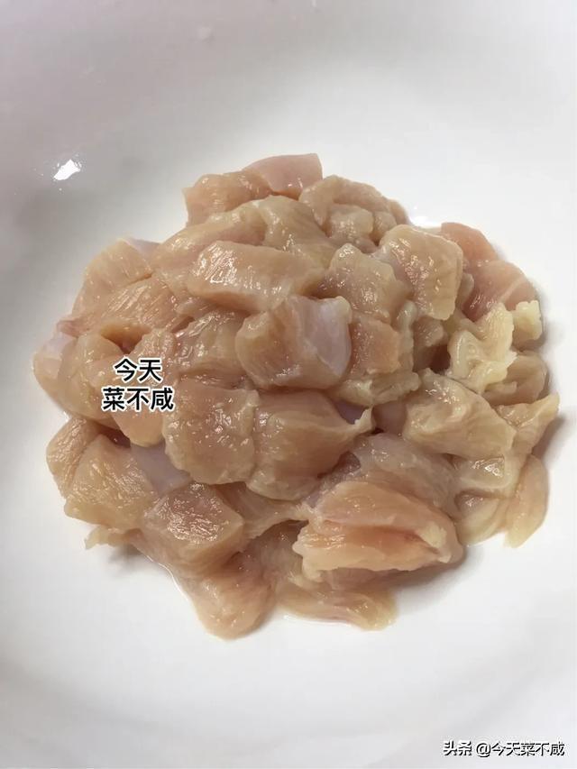 1、把鸡胸肉剔除筋膜和多余的油脂,切成厚一点的片,再改刀切成2厘米见方的丁。