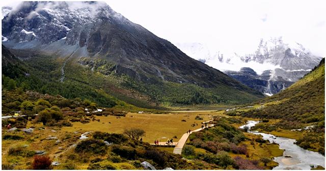 稻城秋色冲古寺附近的草场、小溪被三座神山环绕,贡嘎河从草场穿梭