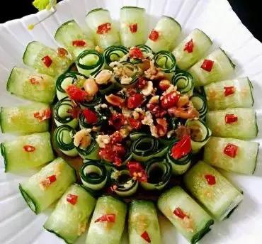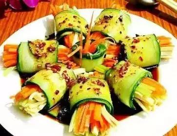 其实还有一个简单的黄瓜卷做法啊,就是直接把黄瓜片卷成小卷,淋上料汁就可以吃了,这个更方便的哦,不过没有里面卷上胡萝卜好看的。