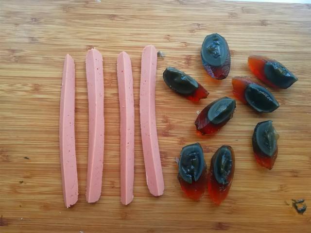 2.将火腿肠顺长平均切成4条,每个松花蛋平均切成4瓣