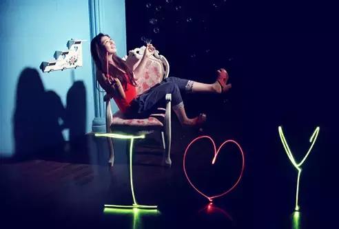 这是一张利用闪光和环境光叠加的照片。在这张画面上我们可以看到两种光源,第一个是照射主角的灯光,第二个是前面的荧光效果。从人物身后的光影能看出,照射人物的光源是闪光灯,前面的荧光其实是用手电筒的光源拍摄的,在手电筒的前面加上不同颜色的色片,画出的轨迹就是不同的色彩。