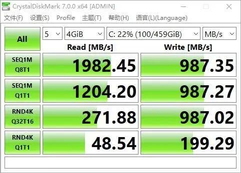空盘状态下,这张盘的读写分别能达到 1982 MB/s 和 987 MB/s ,属于前几年 NVMe 固态硬盘的基本操作。