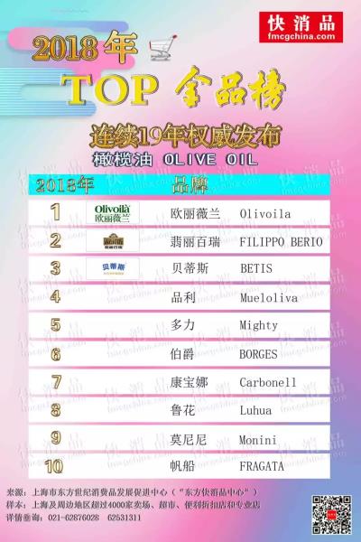 线下橄榄油——欧丽薇兰、翡丽百瑞、贝蒂斯、品利稳居前四 鲁花跻身榜单