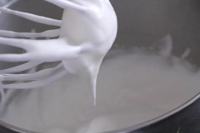 蛋白中的细小泡沫很多,并且呈现奶油白色,举起打蛋器时蛋白呈现下垂状态,即使大力晃动尖椎依旧朝下。