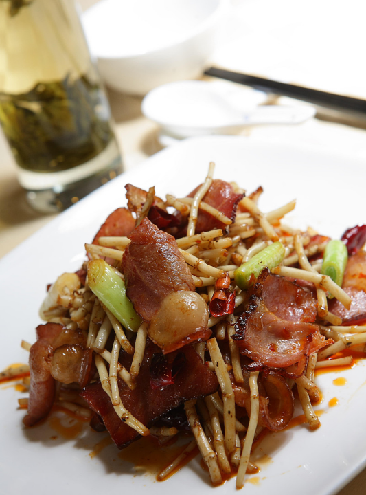 ⒉腊肉炒窝笋。窝笋已经上市,最是鲜嫩,营养丰富,春天当家蔬菜之一。腊肉如上述泡制,窝笋去皮切片,葱姜爆锅,先炒窝笋片,再放腊肉继续大火翻炒,腊肉出油关火,装盘上桌。
