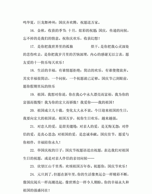 16、十月,良辰美景;国庆,佳节喜庆;短信,传递真情,祝福,浪漫温馨;快乐,如影随形;幸福,必须肯定。祝:国庆节快乐!