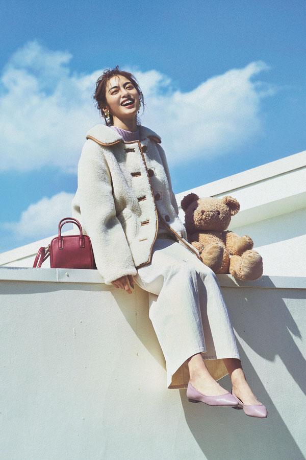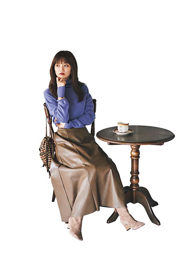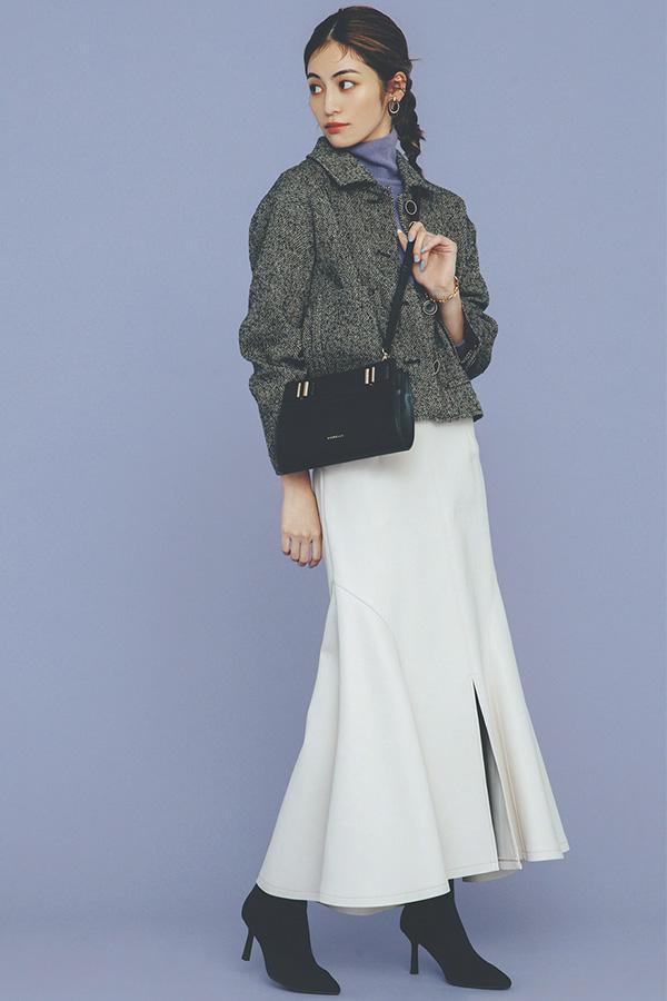 针织和裙子都是女性化的,以薰衣草色为中心渐变。充分发挥薰衣草色的华丽的关键是不要使用白色外套或浅灰色靴子之类的紧身颜色,而是将它柔和地放在一起。通过将整个事物以冰冷的颜色组合在一起,营造出透明的女性气质。