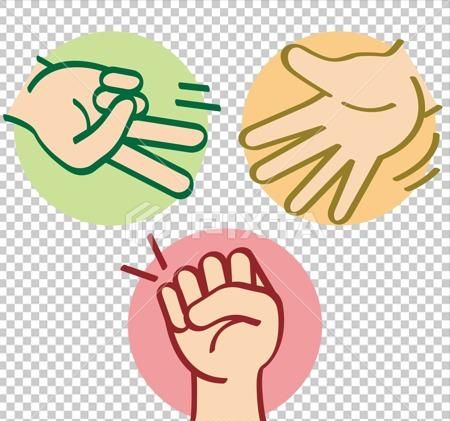 布:五指伸直,张开手掌。手心向下,或向上,或竖直(拇指向上)。每一个手势代表一个“武器”,互相克制的原则是:剪子剪不动石头(石头胜利);布被剪子剪开(剪子胜利);石头被布包裹(布胜利)。如果双方出示了一样的手势,就是平局。通常这种简短的比赛可能会被重复多次,以三局两胜或五局三胜来决定胜负。