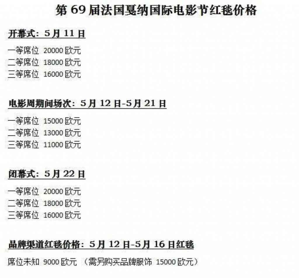 老早就流传出一个戛纳红毯价格表,最低 10 万元打包。