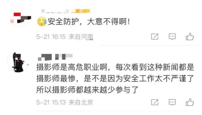 不仅如此,有网友认为摄影师是高危职业,每每看到这种新闻摄影师都很惨,这次发生事故是不是也是安全工作太不严谨了,真是大意不得。