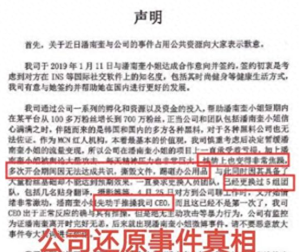 潘南奎所在公司发出声明,表示自从签了潘南奎之后,公司一直不遗余力地捧她,先后给她安排了5个团队。