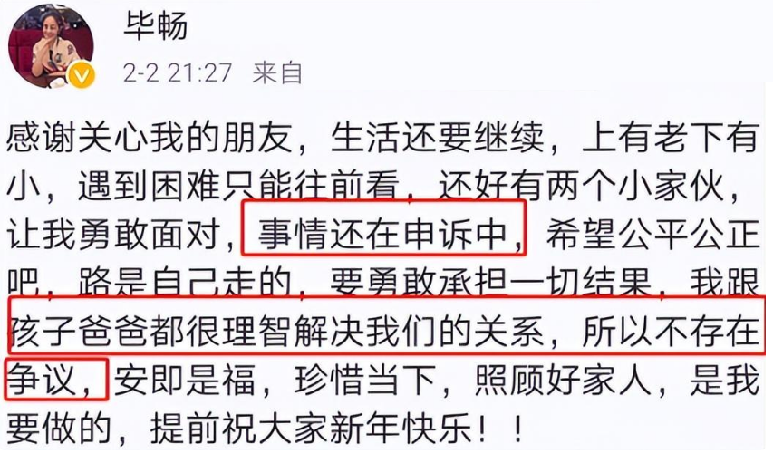 2021年毕畅通过社交媒体发文,已经与孩子的爸爸解除了关系,表明离婚,通过3年的时间走出了阴霾,结束了这段不堪的婚姻。
