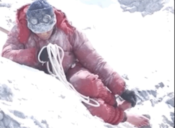 《攀登者》中,在零下十几度的雪地里,赤脚拍摄。