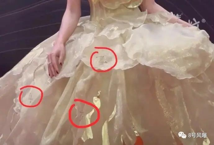 不过这倒没什么,毕竟一场活动明星都有几套备选礼服,但是又有眼尖的网友发现她的裙子上有数字标记,工作室出图也没有 p 掉。