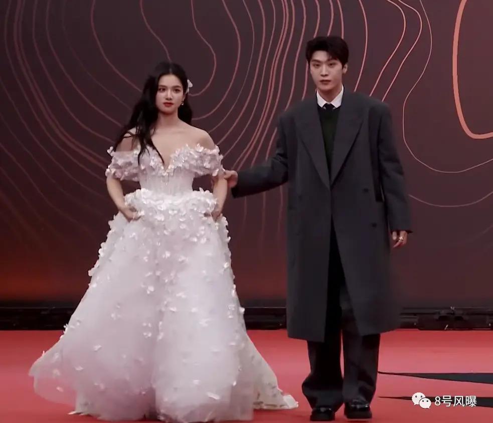 张婧仪身穿白色露肩花裙,范丞丞抓着她的手臂出场像极了婚礼现场,梦回电影《人生路不熟》。