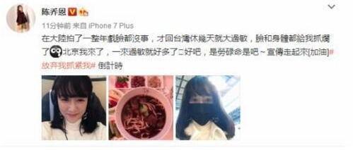 陈乔恩为双腿红疹担忧,自称一回台湾就会过敏,在大陆拍戏都没事