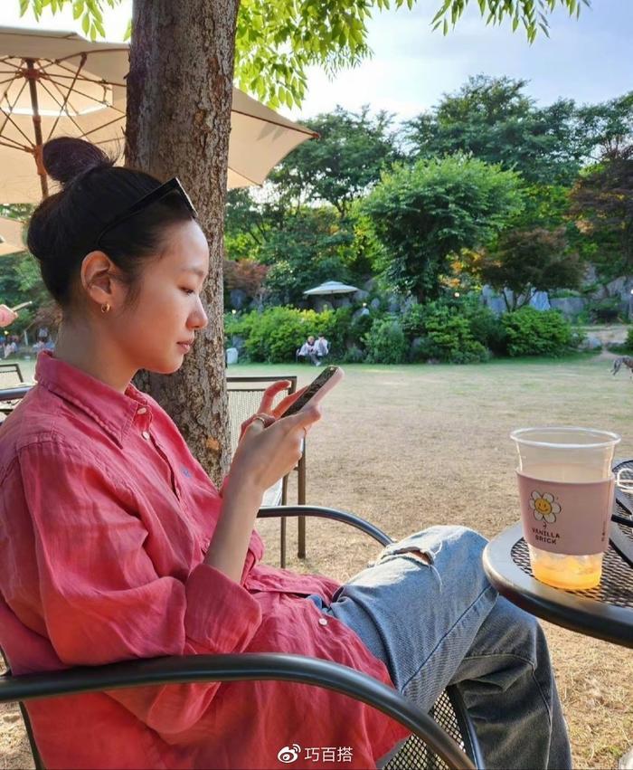 这次侧脸入镜的她,依然是纯素颜状态,头扎简约丸子头身穿粉色衬衫和蓝色阔腿牛仔裤,简约随性又有辨识度,喜欢休闲慵懒风的姐妹可以码住,如你所见,像她一样不化妆,也能穿出高级效果。