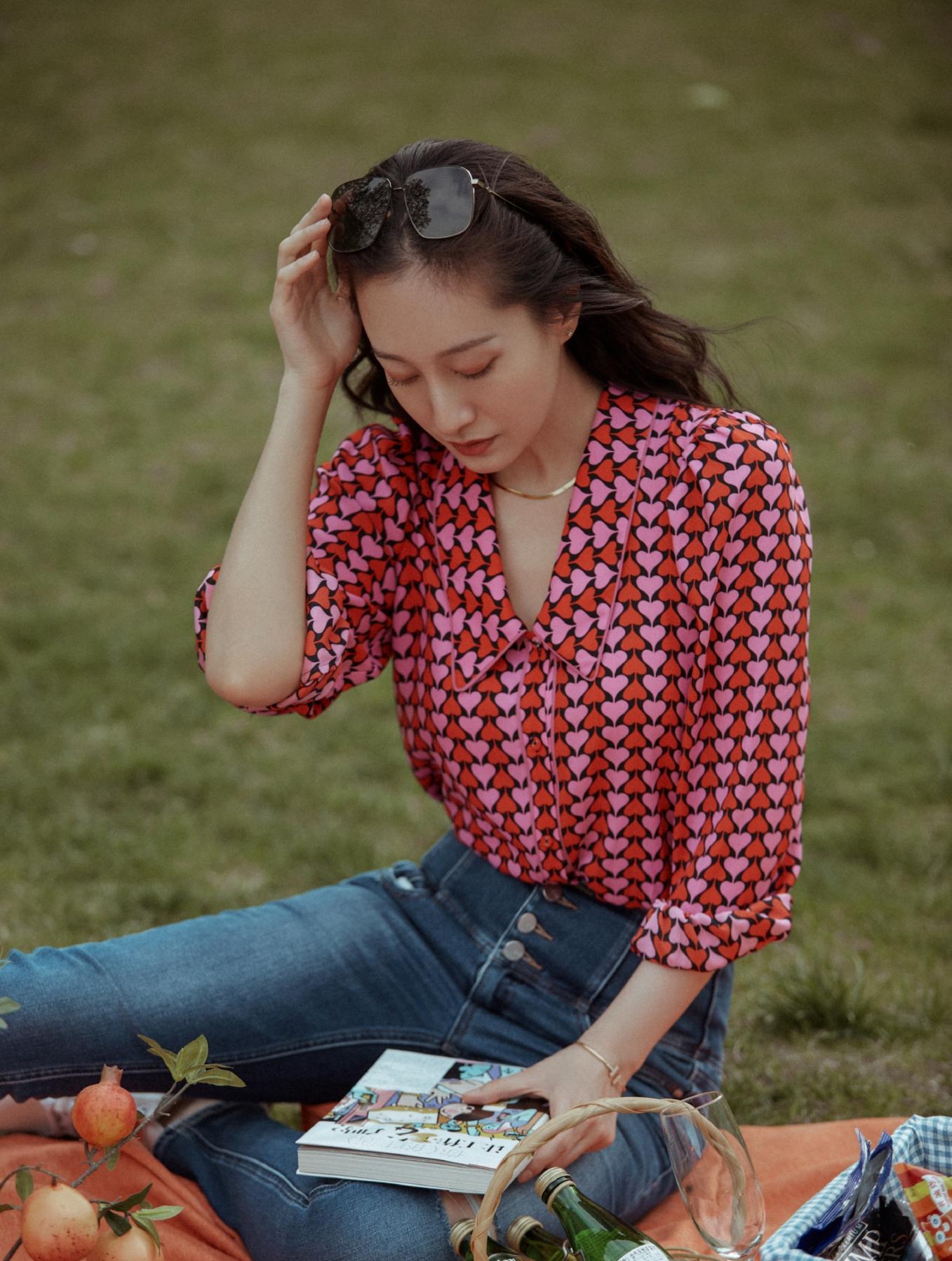 太阳镜挂在头发上,她的头发披散到后背。她拿着书本,一副知性女子的风范,坐在郊外的草坪上,上面铺了一块布 ,布上摆满了食物和饮料。