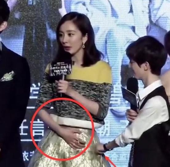 除此之外,在一次发布会上,也是被一位老板从后面紧紧搂住,手足无措的杨幂只好用手臂将自己的重要部位挡住。