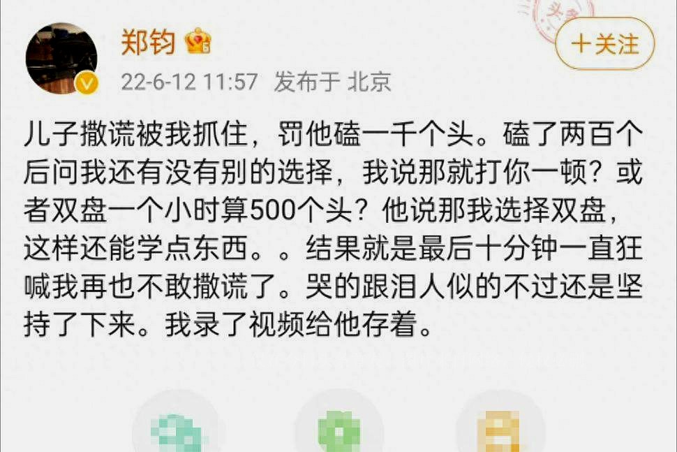 郑钧的儿子最终在最后十分钟开始哭喊,表达出不再敢撒谎的意愿。尽管郑钧在发文中描述了儿子的崩溃模样,但他并没有停止这一严厉的教育方式,甚至拍摄了视频记录下来。