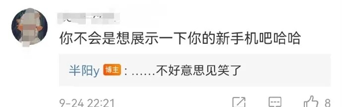 而这次发文表示再见,葫芦岛!更是被细心的网友发现半阳竟然用的是最新的苹果13!于是网友调侃半阳:你不会是想展示一下你的新手机吧!没想到半阳竟然回应了:不好意思见笑了!