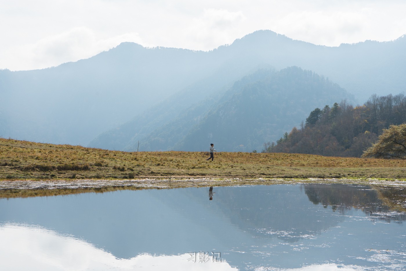 甘海子很小,就像一个小池塘,但有了它,风景就有了另一番滋味,远山,人,树倒映在水中。