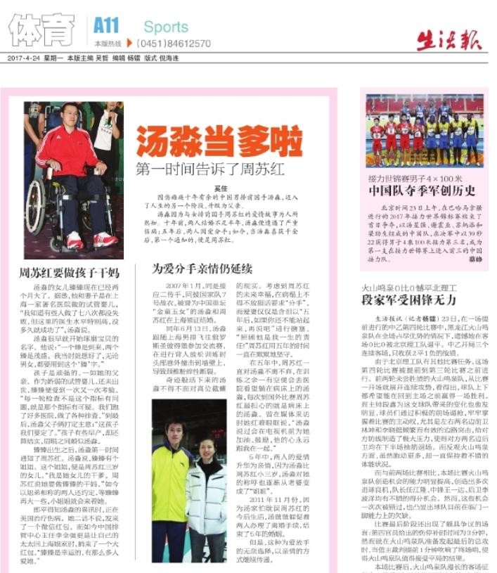 瘫痪17年汤淼现状:运动员妻子早已改嫁,女儿7岁,郎平多次探望