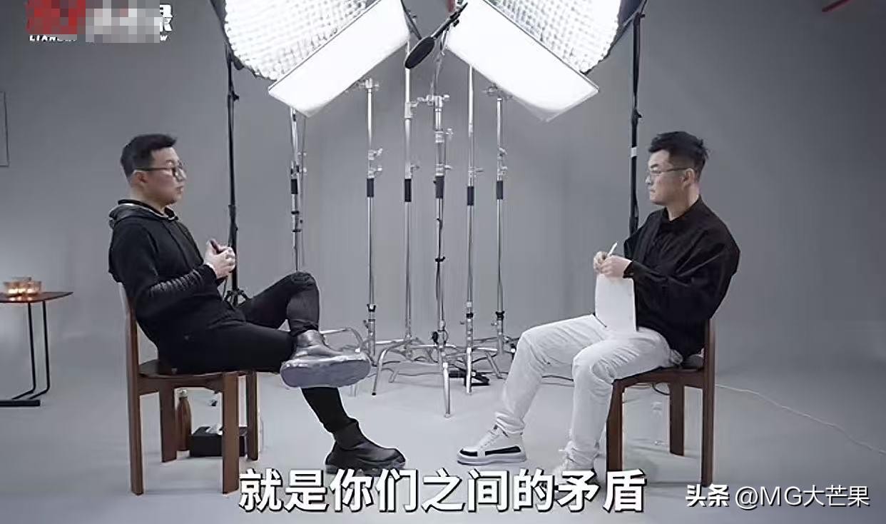 他接受了一位网红博主的采访,穿了一身黑衣与博主面对面坐在椅子上交流,看起来非常正式的感觉。