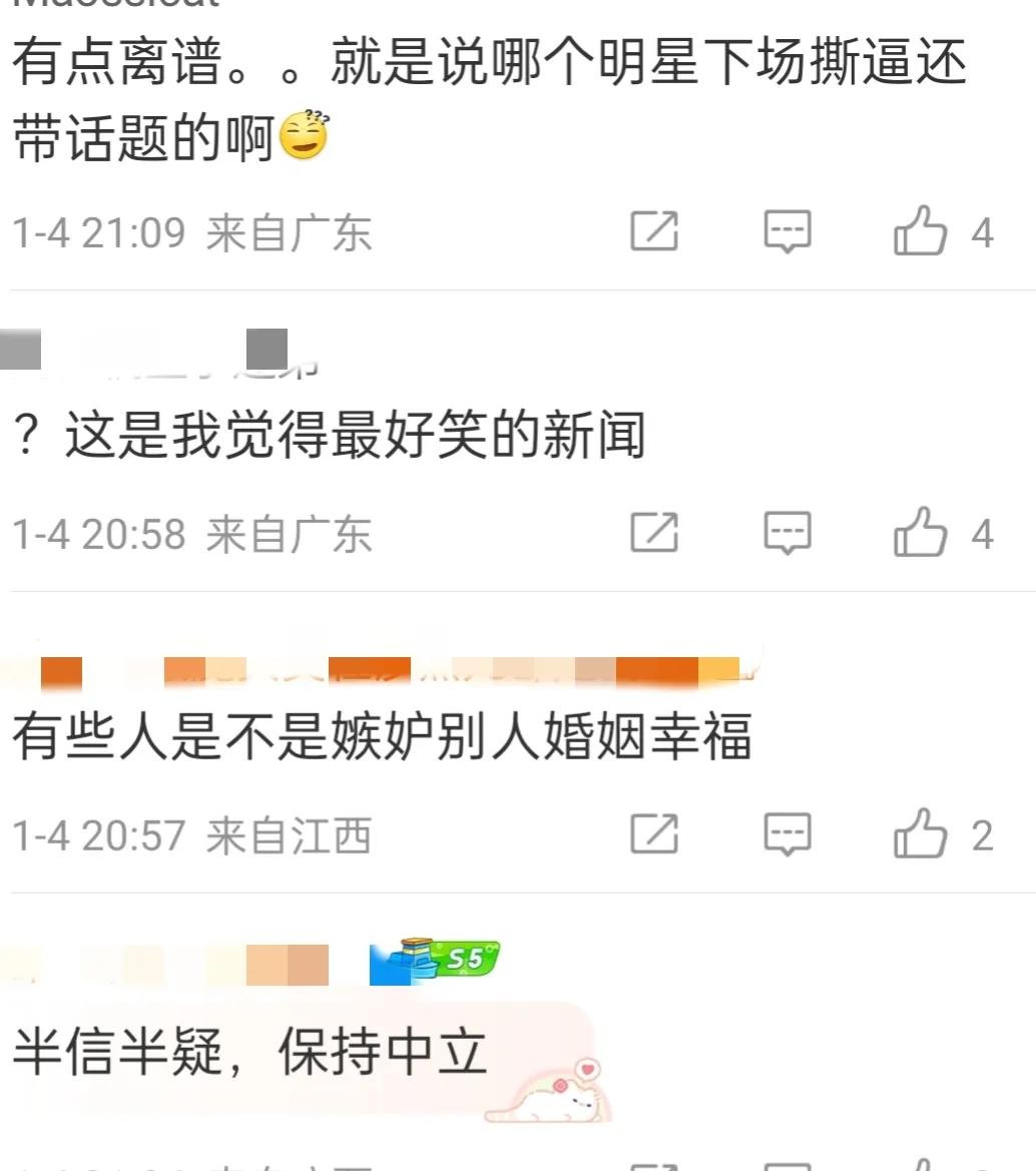 有的网友则认为空穴不来风,娱乐圈很多事情都是越离谱越是真的,之前也有不少明星发文秒删的,更有许多明星夫妻看似恩爱,实际上早就离婚或者感情出了问题的。