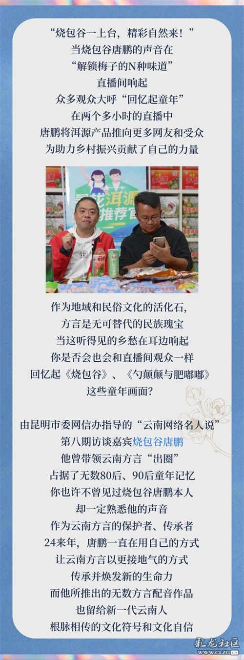 由昆明市委网信办指导的“云南网络名人说”第八期访谈嘉宾烧包谷唐鹏,他曾带领云南方言“出圈”,占据了无数80后、90后童年记忆,你也许不曾见过烧包谷唐鹏本人,却一定熟悉他的声音。作为云南方言的保护者、传承者,24来年,唐鹏一直在用自己的方式,让云南方言以更接地气的方式传承并焕发新的生命力,而他所推出的无数方言配音作品,也留给新一代云南人根脉相传的文化符号和文化自信。
