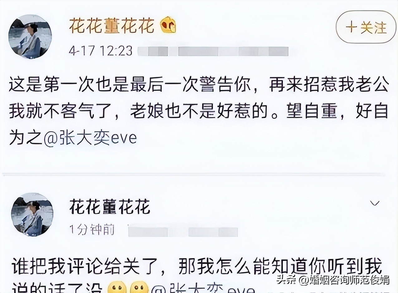当时董花花切断这种第三者的方式也是掐住了这个命门,下手比较狠,就是在网络上直接曝光,把事情扔到台面上来解决,等于是毁了第三者的事业,也毁了她老公的事业。