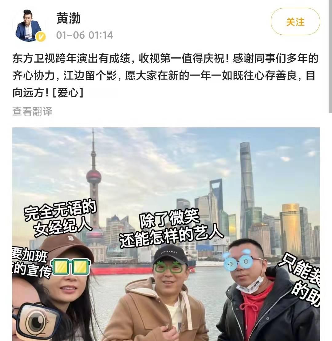 他发布了一张在上海江边拍照留念的照片,同时表达了自己对东方卫视跨年活动成果的满意以及对团队成员共同努力的感激。