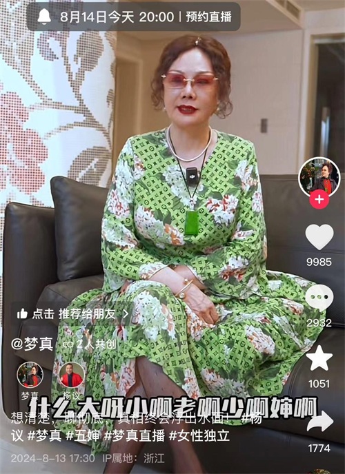 面对铺天盖地的质疑和猜测,作为杨议的妻子,孟真最终选择了沉默。然而,随着事态的发展,她终于决定站出来发声。在8月13日发布的视频中,孟真表示将在14日晚8点进行直播,与大家聊清楚这些传言。她的一番话引起了广泛关注,许多人都在猜测她究竟会说些什么。