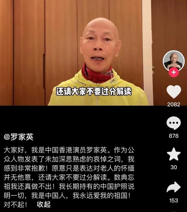 他在视频中言辞恳切地表示自己是中国香港演员罗家英,对于此前未经深思熟虑后的哀悼之词表示抱歉。他辩解称愿意只是表达对老人的缅怀并无他意,恳求大家不要过分解读。