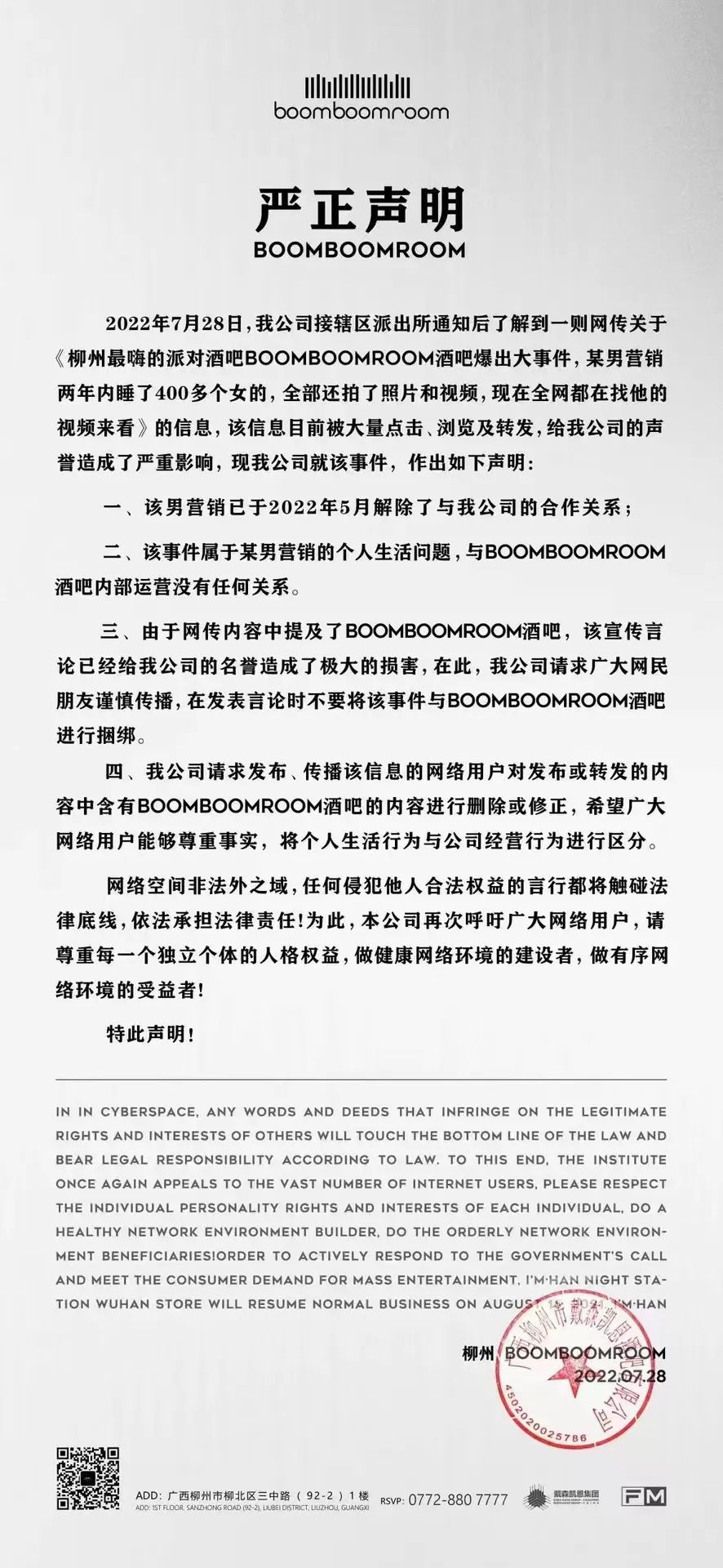 2022年7月28日,我公司接辖区派出所通知后了解到一则网传关于《柳州最嗨的派对酒吧BOOMBOOMROOM酒吧爆出大事件,某男营销两年内睡了400多个女的,全部还拍了照片和视频,现在全网都在找他的视频来看》的信息,该信息目前被大量点击、浏览及转发,给我公司的声誉造成了严重影响,现我公司就该事件,作出如下声明: