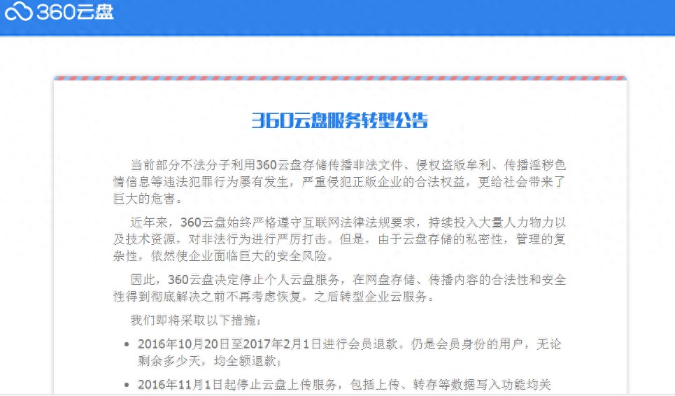 360云盘宣布逐步关闭个人云盘服务,转型企业云服务。在网盘存储、传播内容合法性和安全性得到彻底解决之前不再考虑恢复。