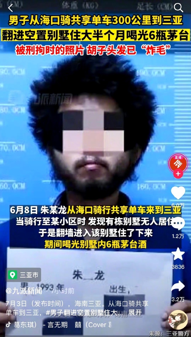 【痞幼:吃瓜吃到自己头上,这新闻过于离谱让人不敢信】男子从海口骑共享单车到三亚,翻进一座别墅“蹭”住半个多月,还把别墅主人的6瓶茅台喝光了。