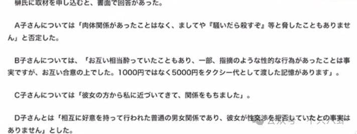 他反驳说,和 A 没发生关系;和 B 发生过,但是在都喝醉的情况下,顺其自然发生的(最无语的是他还澄清说其实给了 B 女 5000 日元(230 多 rmb)打车费不是 1000);至于 C 是主动接近自己;D 女则是和他互有好感,称其从来没有拒绝过自己。