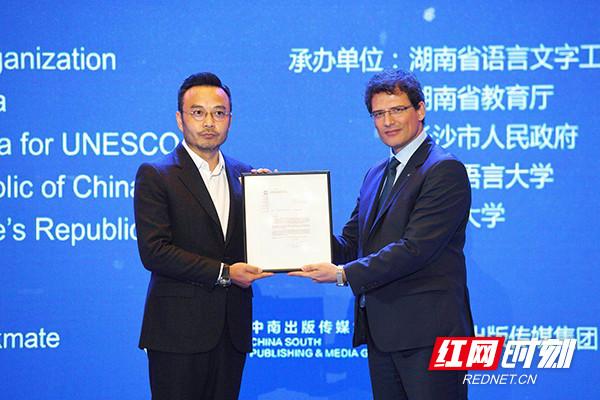 大会现场,联合国教科文组织助理总干事穆兹·查楚克(Mr Moez Chakchouk)为汪涵颁发感谢荣誉证书,以感激他在语言保护中所做的贡献。