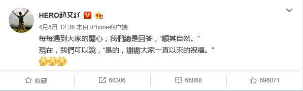 今年4月8日,赵又廷在网上大声宣布高圆圆怀孕的消息。