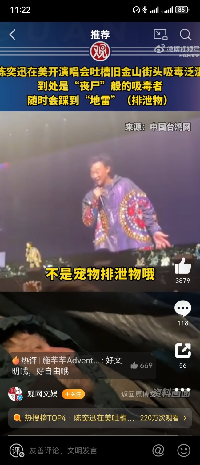近日,陈奕迅在美开演唱会吐槽旧金山街头吸毒泛滥,到处是“丧尸”般的吸毒者,随时会踩到“地雷”(排泄物)。