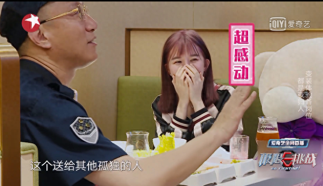 面对化了妆的“怪叔叔”孙红雷,也并不介意他坐在旁边,还很坦诚的借手机给孙红雷照着卸妆,最后帅雷雷还送给她一个人性比例的小熊玩偶。