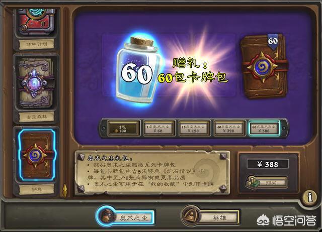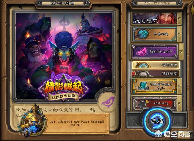 卡包DLC:卡包类型的DLC性价比最低,包含地精大战侏儒、冠军试炼、上古之神、安戈洛、冰封王座、狗头人、女巫森林、砰砰计划、大乱斗、暗影崛起和即将推出的奥丹姆奇兵。虽然暴雪加入了防止开出已有橙卡的机制,但是开包的随机性和当前版本较低的橙卡概率,并不适合新手集卡。以上版本DLC除奥丹姆奇兵外购买优先级相同。如果只想在标准模式玩耍,仅按需购买女巫森林、砰砰计划、大乱斗、暗影崛起、奥丹姆奇兵即可,其他卡包DLC已经退环境。特殊DLC:达拉然大劫案达拉然大劫案虽然算是冒险模式,但并不是作为一个大版本推出的,实际其为暗影崛起的衍生版本,全部奖励只有15个卡包和一张“泽尔,暗影斗篷”。